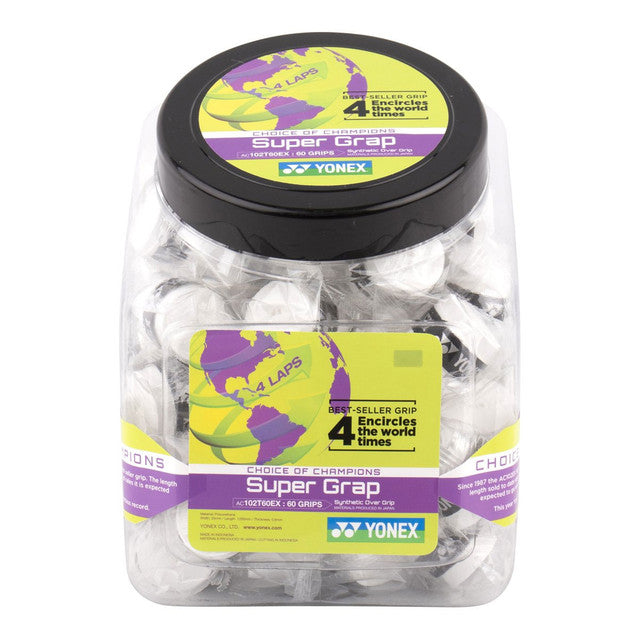 The Yonex Super Grap 60 piece bucket gives you plenty of choices and protection for your racquet handle. Super Grap enhances the playability of your racquet by absorbing shock and perspiration to give you excellent control and feel. It has a tacky/sticky feel so you can hold the racquet handle comfortably.